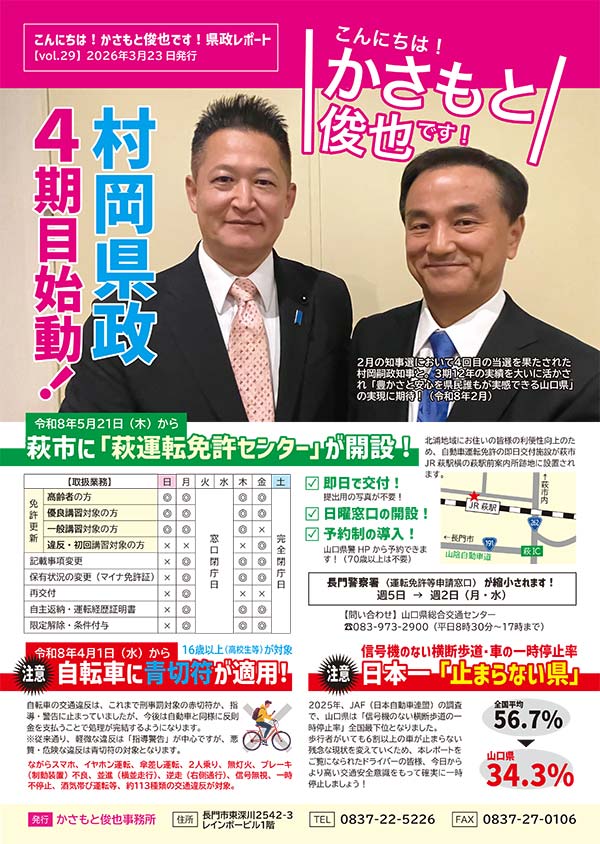 年に2回発行する「こんにちは!かさもと俊也 県政レポート」山口県議会の一般質問や写真レポートなどを掲載しております。PDFのダウンロードは下記より可能ですので、ぜひご覧ください。過去の県政レポートは「かさもと俊也県政レポート」よりお進みください。